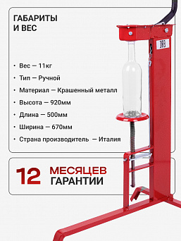 Аппарат окрашен в красный цвет, ручка в черный, с резиновой накладкой для удобства процесса. Итальянское качество обеспечивает долговечное и простое использование укупоривателя пробок.